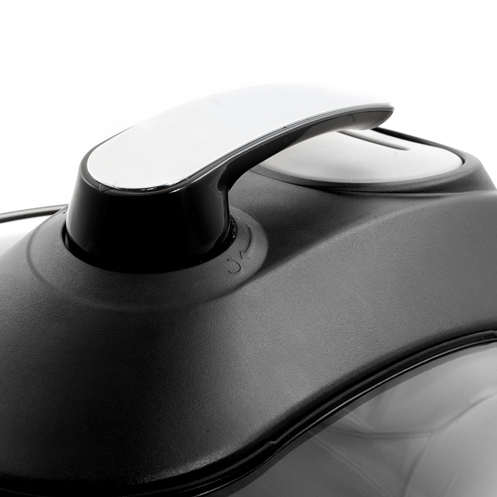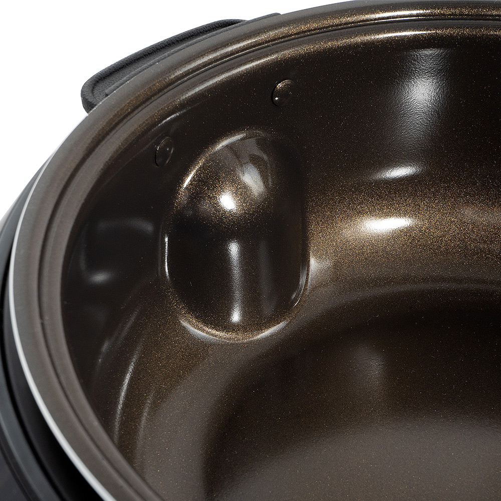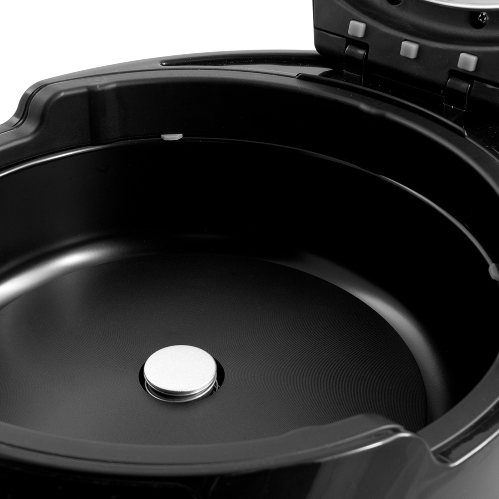 Внутренняя кастрюля мультиварки состоит из легкой алюминиевой кастрюли с высококачественным и прочным керамическим покрытием. Ее объем составляет 5 литров. Корпус практичного кухонного прибора изготовлен из прочного пластика без содержания бисфенола. Гладкие поверхности легко очищаются.