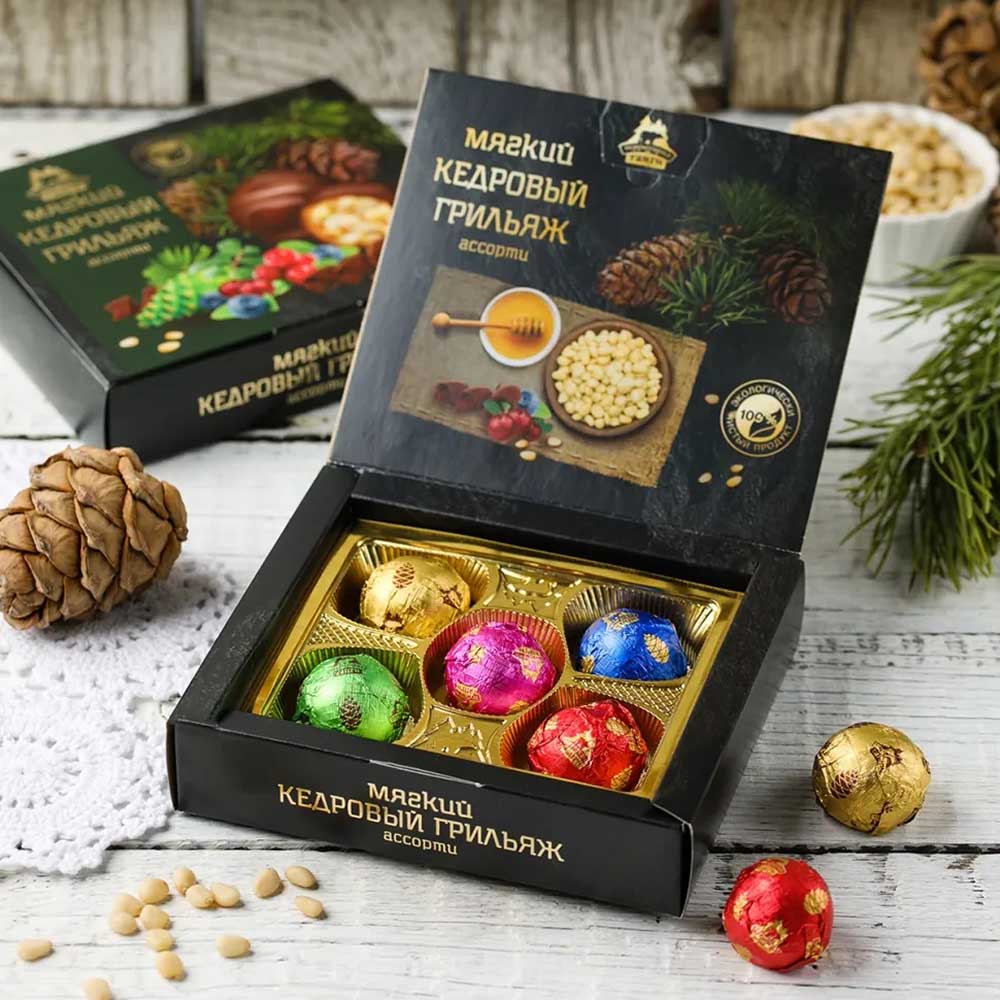 Попробуйте изысканное лакомство из Сибири!Корпус конфеты состоит из цельного ядра кедрового ореха высшего сорта в сочетании с таежным медом и ягодами, покрыт натуральным бельгийским шоколадом "Barry Callebaut".