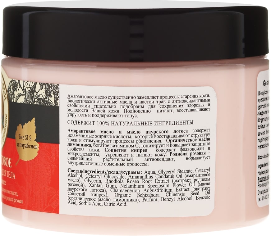 Состав: Aqua, Glyceryl Stearate, Cetearyl Alcohol, Cetearyl Glucoside, Amaranthus Caudatus Oil (амарантовое масло), Glycerin, Rhodiola Rosea Root Extract (экстракт родиолы розовой),Xantan Gum, Nelambium Speciosum Flower Oil (масло даурского лотоса), Chamaenerion Angustifolium Extract (экстракт соцветий кипрея), Organic Schizandra Chinensis Seed Oil (органическое масло лимонника),Parfum, Benzyl Alcohol, Benzoic Acid, Sorbic Acid, Citric Acid.