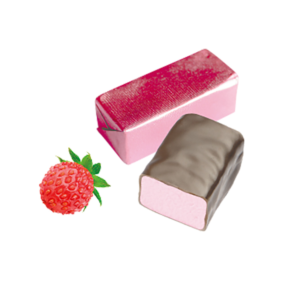 Состав: шоколадная глазурь (сахар, масло какао, какао-порошок, лецитин соевый (эмульгатор)), сахар, молоко сухое цельное, ядро кедрового ореха, масло кокосовое, эквивалент какао-масла, земляника сублимированная, экстракт свеклы, матча, экстракт земляники