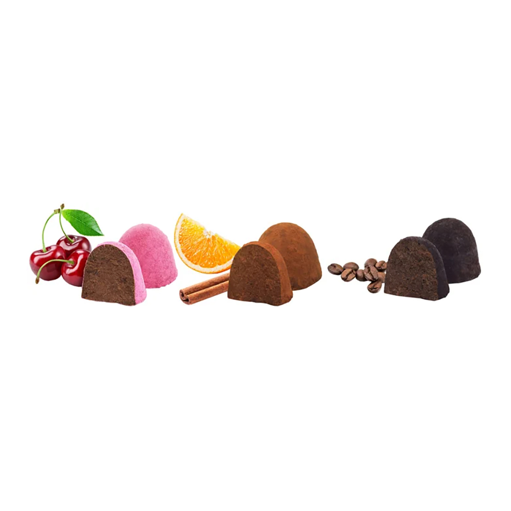 - Сибирский трюфель Ассорти с кедровой настойкой, 100 г: апельсин - 4 шт, вишня - 3 шт, кофе - 3 шт