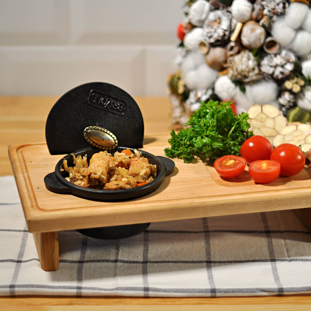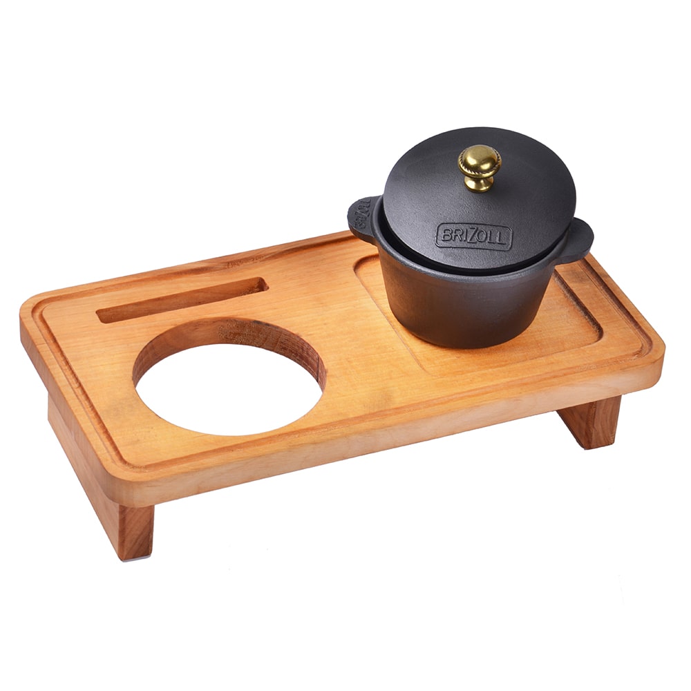 - 1 x Чугунная сервировочная кастрюля BriZoll, 300 мл, с деревянной подставкой.