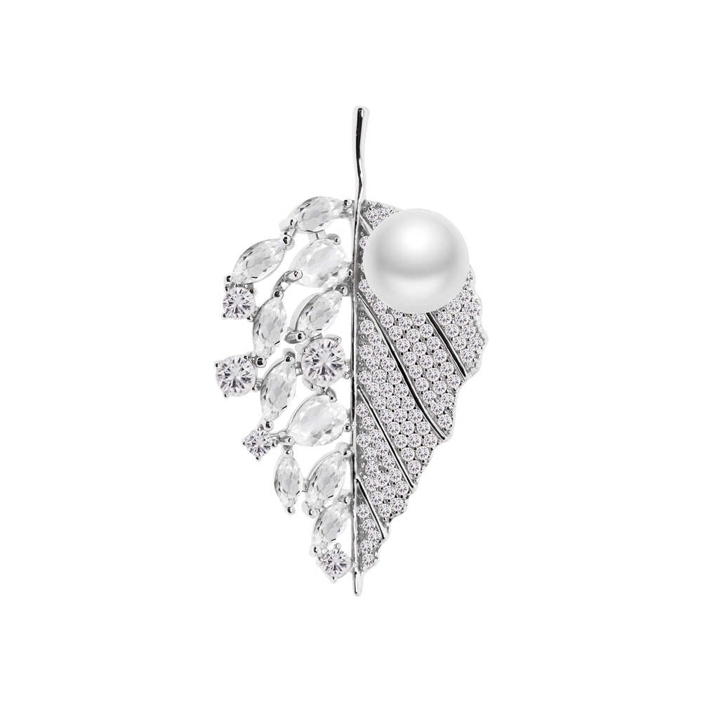 Брошь из серебра 925 пробы в форме листа с фианитами и жемчугом