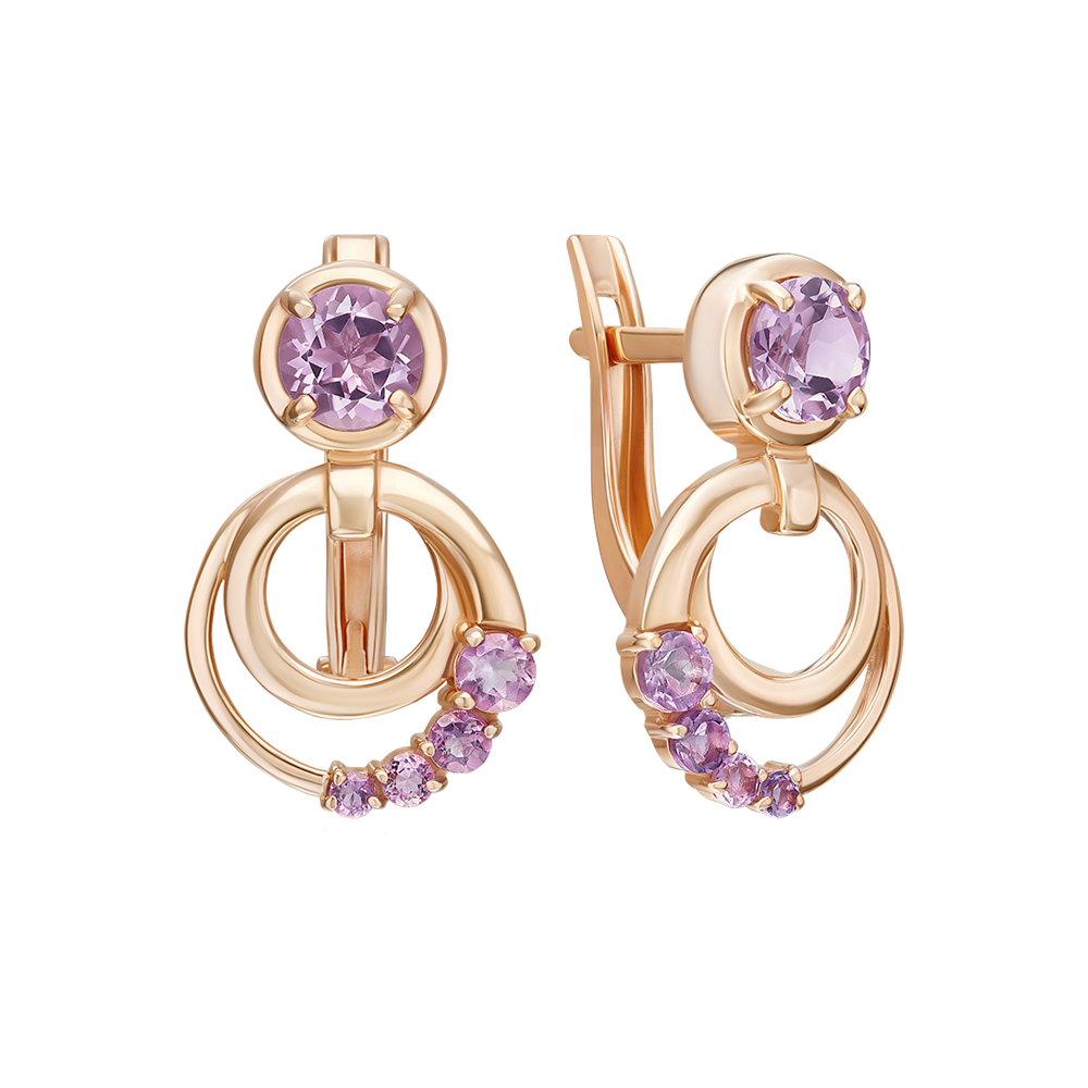 Очаровательные серьги из красного золота 585 пробы, украшенные аметистами нежно-лавандового оттенка.