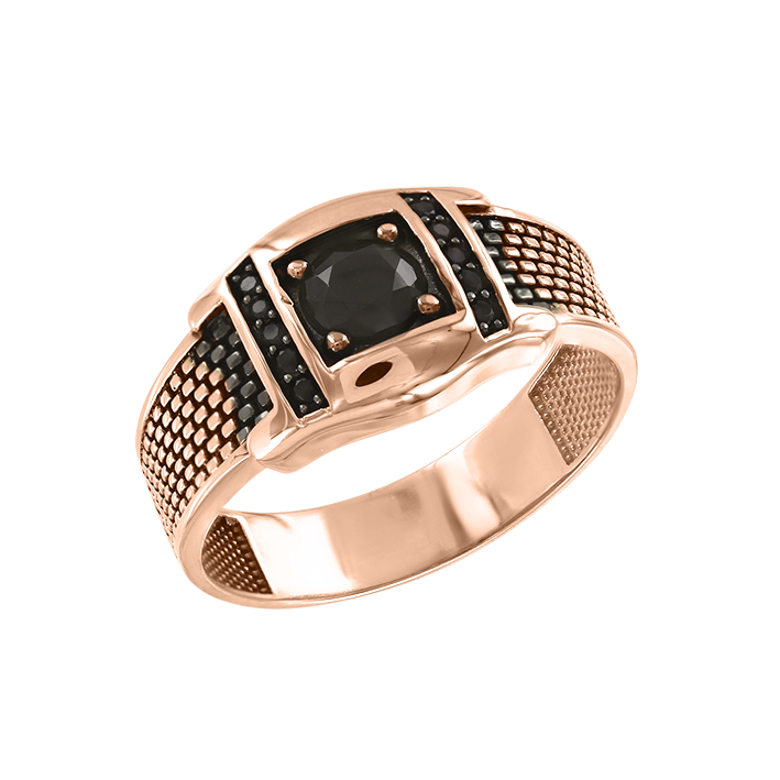 Эффектное мужское кольцо из красного золота 585 пробы, с черными фианитами.