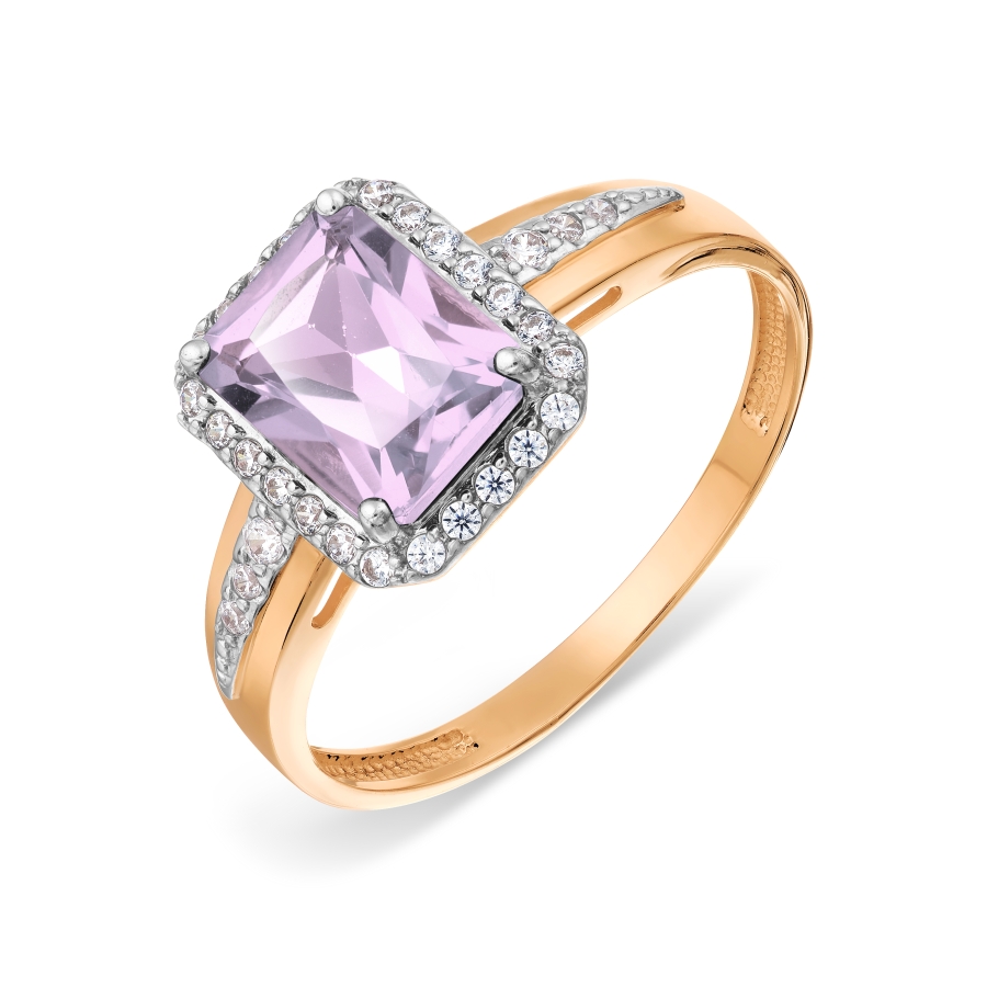 Великолепное женское кольцо из красного золота 585 пробы, украшенное центральным аметистом размером ≈ 8×6 мм и обрамлённое сияющими фианитами.