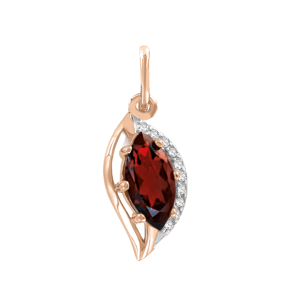 Элегантная подвеска из красного золота 585 пробы, c вставками из граната и фианитами, высотой ≈ 21 мм. Один из самых красивых природных камней, отличается особенно живой аурой и энергетикой. Камень, который имеет тёмно-красный цвет и вспыхивает на солнце яркими красками, является излюбленным дополнением к украшениям страстных натур. Нежно мерцающие фианиты, придают украшению живость и очарование, подчеркивая красоту граната.