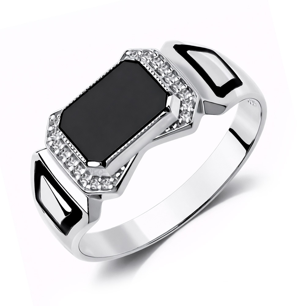 Стильное украшение, сочетающее мужественную строгость и современную изысканность. Прямоугольный чёрный оникс, обрамлённый сияющими фианитами, создаёт эффектный контраст, подчёркивая благородный блеск серебра. Кольцо станет ярким акцентом в деловом или вечернем образе и отличным выбором для тех, кто ценит элегантные аксессуары.Советы по хранению и уходу за ювелирными изделиями: