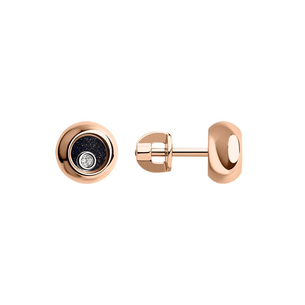 Элегантные серьги-пуссеты из красного золота 585 пробы с бриллиантом 0,033 ct. WSI, с авантюриновым стеклом HTS, сапфировым стеклом HTS, диаметр ≈ 7,5 мм