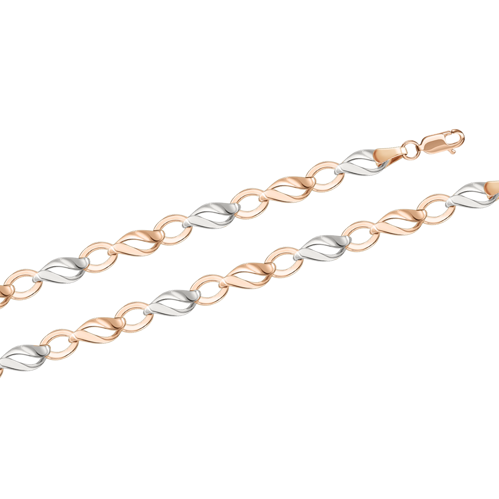 Этот элегантный браслет из российского красного и белого золота 585 пробы - изысканное украшение для женщин, любящих мелкие детали и необычные материалы. Сочетание теплого красного золота и холодного белого золота придает браслету современный двухцветный вид с классической элегантностью. Браслет длиной 18,19 см и шириной около 5-7 мм удобно сидит на запястье и подходит как для повседневной носки, так и для особых случаев. Высокое качество изготовления и элегантный дизайн делают этот браслет стильным спутником и прекрасным подарком.Характеристики: