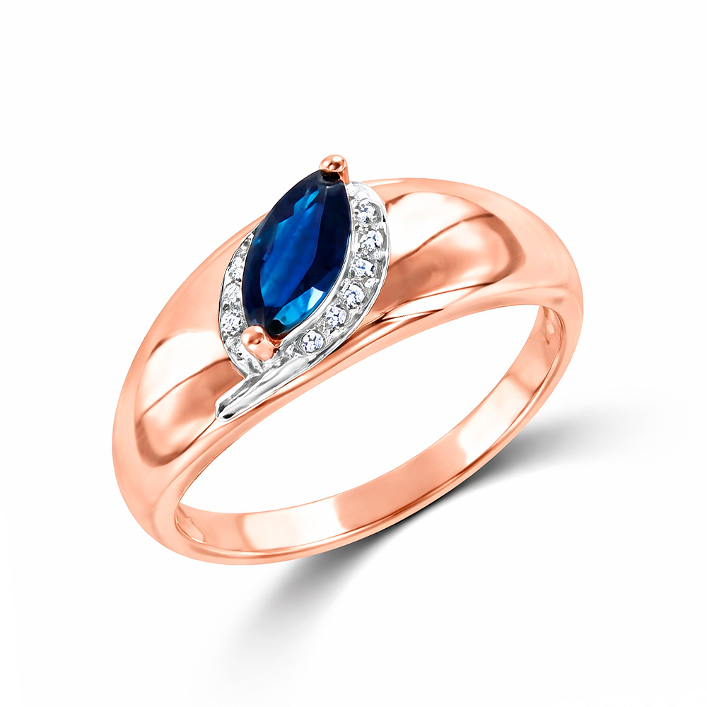 Изысканное женское кольцо из красного золота 585 пробы, инкрустированное 12 бриллиантами 0,037 ct. WSI и сапфиром ≈ 8x4 мм, ширина ≈ 8,2 мм. Сапфир с огранкой “Маркиз”, - олицетворяют с уверенностью, успехом и победой. Эффектно синий сапфир выглядит в оправе красного золота, обрамленные бриллиантами, где камни переливаются и играют на свету. К кольцу есть серьги.