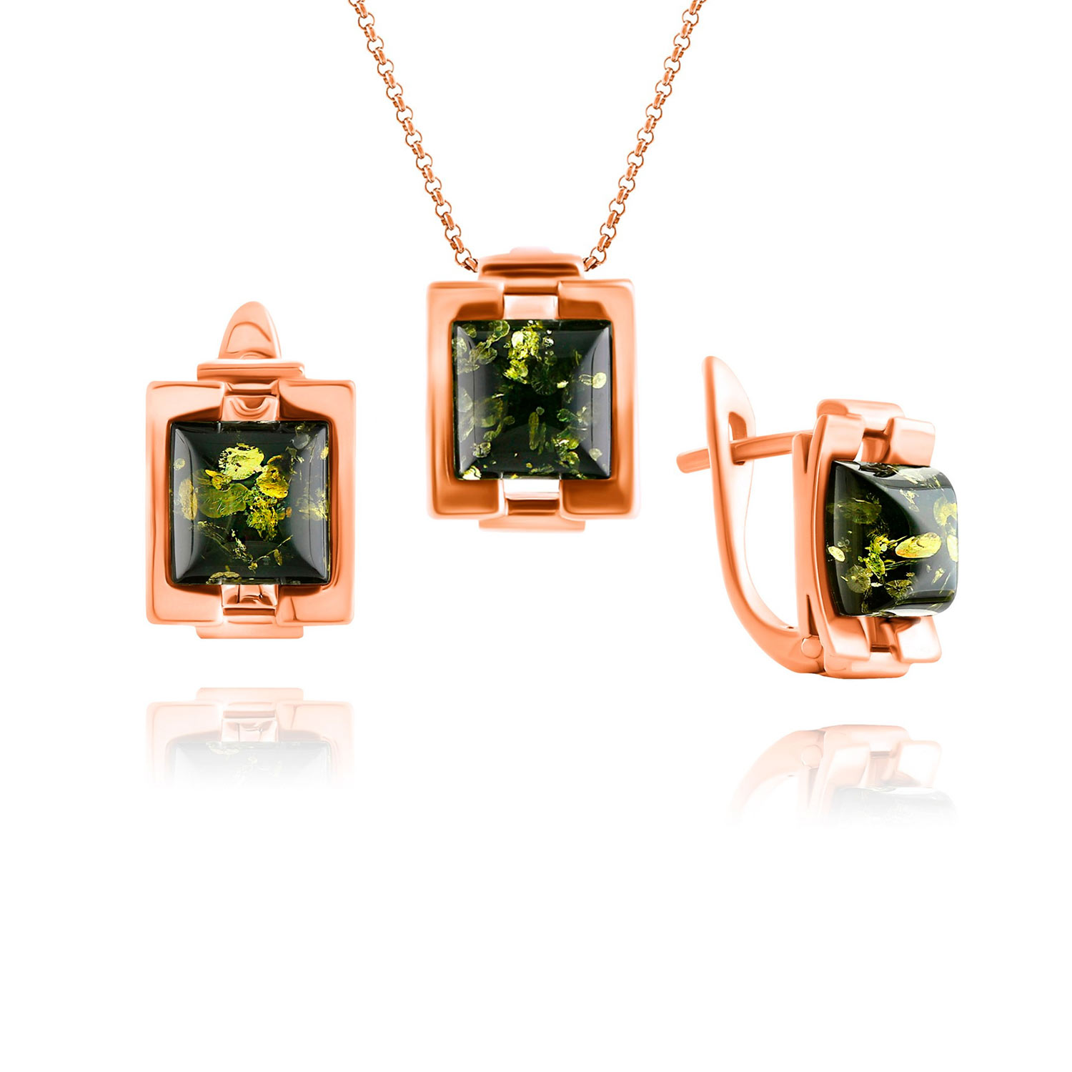 Schmuckset aus 925 Silber vergoldet mit olivgrünen Bernsteinen (Moorbernsteinen) im Quadratdesign