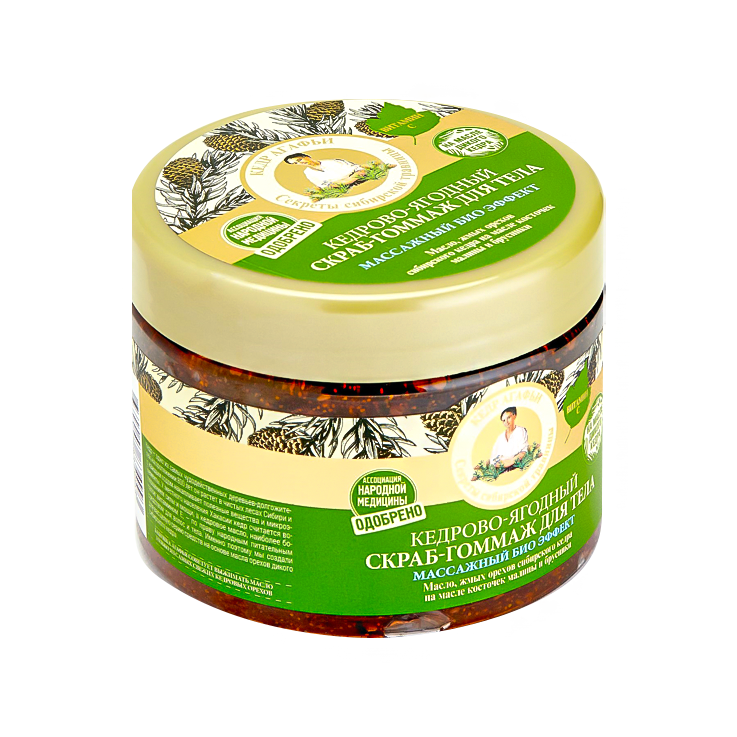 - Кедрово-ягодный скраб-гоммаж для тела, созданный на основе натуральных природных компонентов, обладает массажным био эффектом, выравнивает рельеф, придает коже бархатистость и мягкость.