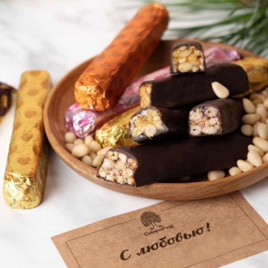 Кедровые палочки — классический твердый грильяж из цельного ядра кедрового ореха в карамельном сиропе, покрытые шоколадной глазурью.Кедровые палочки "Ассорти" — новинка от эко-фабрики «Сибирский кедр», которая объединила в себе палитру вкусов любимой конфеты. Кедровый орех в шоколадной глазури, дополненный яркими вкусами облепихи, малины и чёрной смородины подарят истинное наслаждение и пользу любителям кедровых палочек.