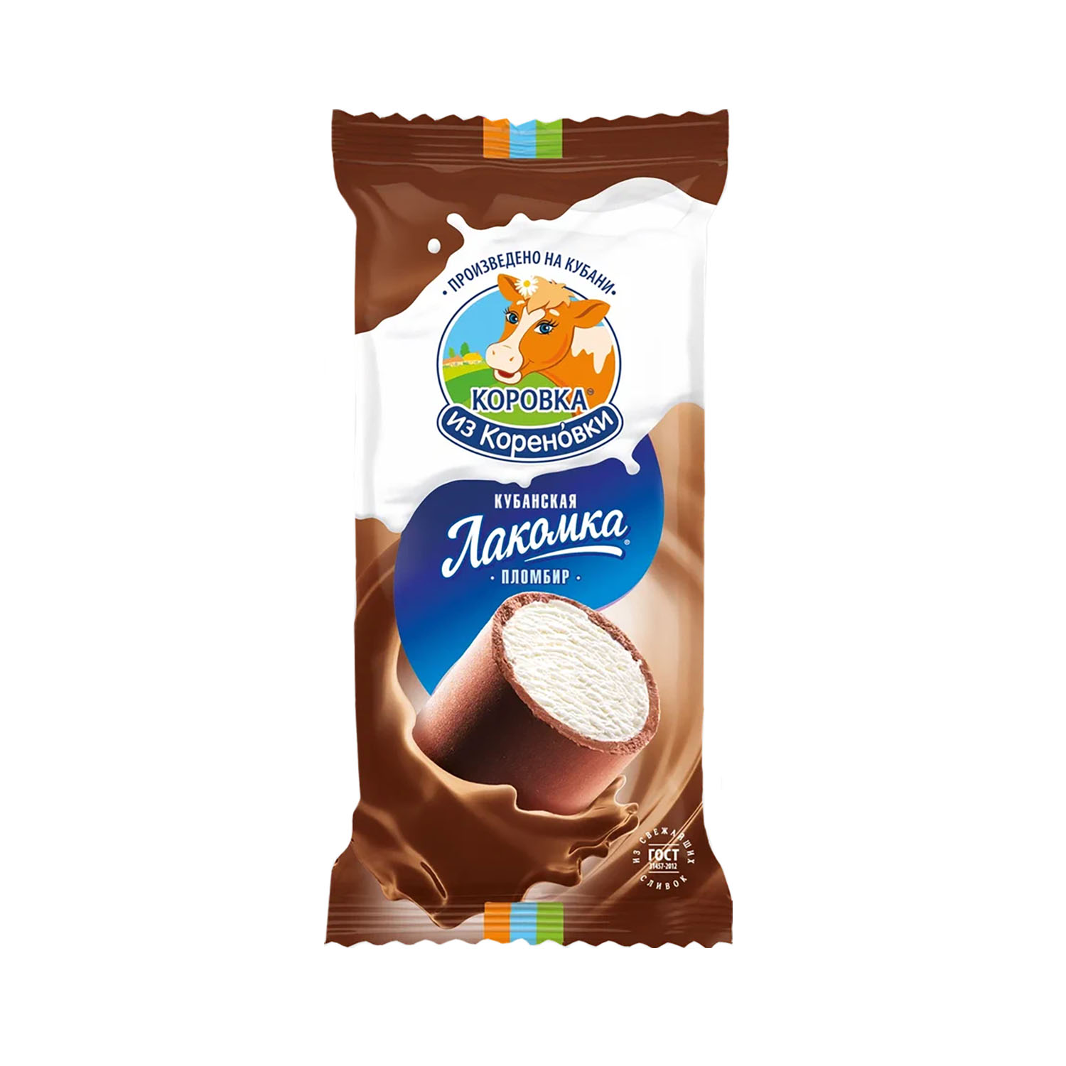 - Лакомка Пломбир в шоколадно-сливочной глазури (90 г) – Нежный пломбир в гладкой шоколадной глазури.