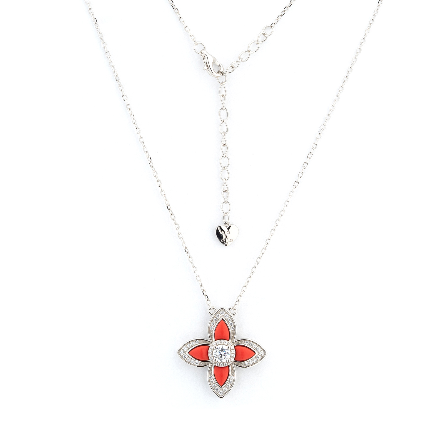 Колье из серебра 925 пробы с подвеской в виде цветка с фианитом и красным кораллом