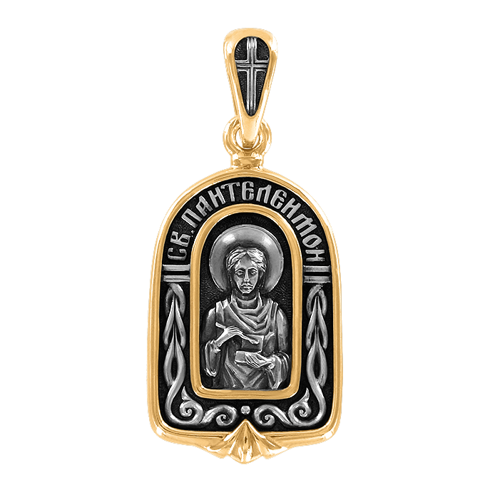 Красивая подвеска-икона - Святой Пантелеймон из серебра 925 пробы, позолоченная, с двухсторонней гравировкой, высота ≈ 37 мм