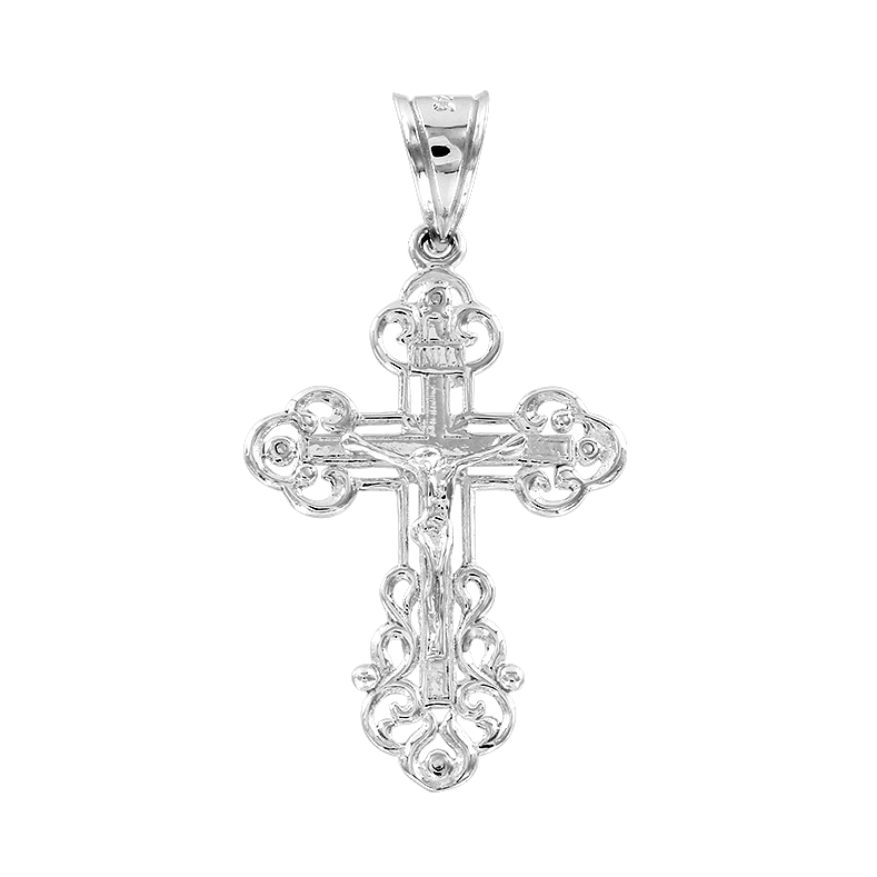 Красивая подвеска-крест с распятием из серебра 925 пробы, с филигранными узорами и гравировкой, высота ≈ 38 мм. Внешнее обрамление креста с ажурными узорами, придают изделию оригинальный вид, легкость и изящество. На передней части буквы IНЦI означают - "Иисус Назорей Царь Иудейский". На оборотной стороне выгравирована надпись "Спаси и сохрани". Изящная модель креста подойдет девушкам и взрослым женщинам. Купить ажурный крест можно как для себя, так и в подарок близким людям. Такой подарок станет светлым воспоминанием на всю жизнь. В современном мире православный крест имеет различные формы и начертания. Не важно, какой крестик вы в итоге выберете, важно, чтобы он действительно стал для вас символом веры и религиозной традиции.