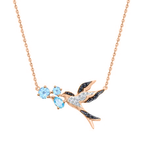 Красивое колье с птицей из красного золота 585 пробы, c вставками из 3 голубых топазов Swiss, 11 черных и 13 бесцветных фианитов, длина ≈ 45 см и 50 см