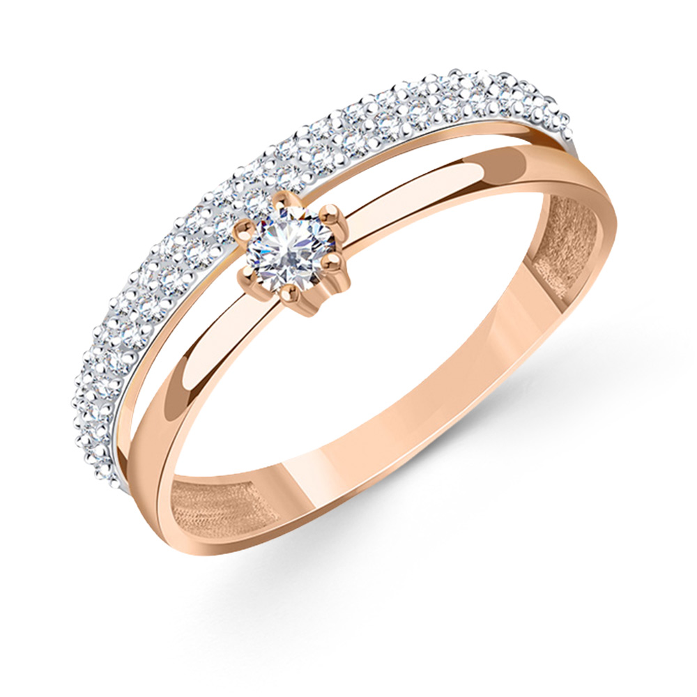 Красивое женское кольцо из русского красного золота 585 пробы, с вставками из 46 фианитов, ширина спереди ≈ 6 мм. Яркое, необычное кольцо притягивает взгляд своим дизайном и качеством ручной работы.Дизайн кольца с разделенной шинкой в виде двух разных тонких колец выглядит стильно и современно, а инкрустированные вставки из фианитов придают украшению легкость и утонченность. Форма кольца в виде кольца из несколько колец является трендом последних лет. Если хочется чего-то особенного и трендового одновременно, можно выбрать модель кольца в виде нескольких колец. Выглядят такие украшения свежо и утонченно. Стильное, великолепное и редкое, оно рассчитано на то, чтобы поразить окружающих и показать, насколько разносторонней личностью является его обладатель. Оно будет актуально при создании практически любого образа.