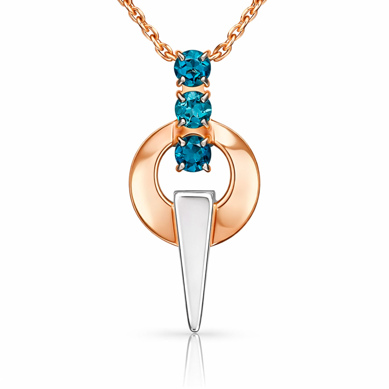 Элегантный кулон из красного и белого золота 585 пробы, украшенный тремя сверкающими голубыми топазами. Высота изделия ≈ 24 мм