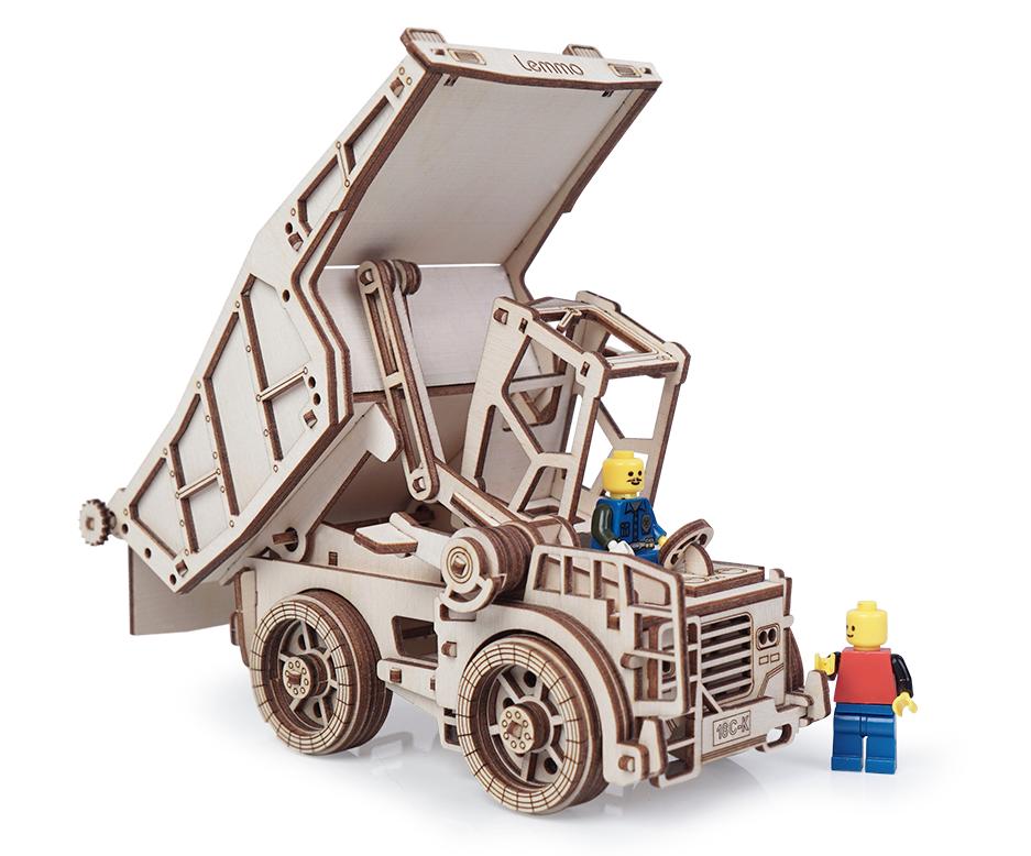 У собранной модели вращаются колеса, откидывается кабина, открывается задний борт кузова, поднимается кузов. Игрушку можно раскрасить акриловыми красками.
