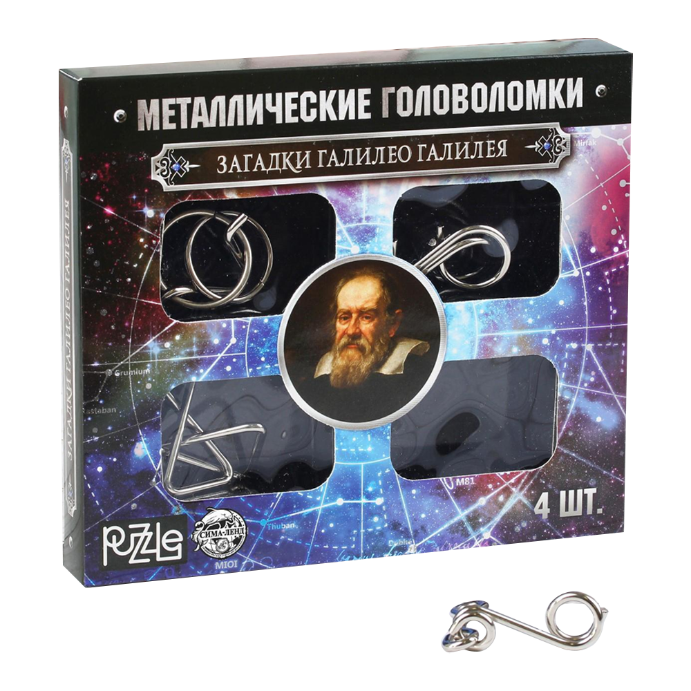 В набор входят металлические головоломки, состоящие из двух частей.