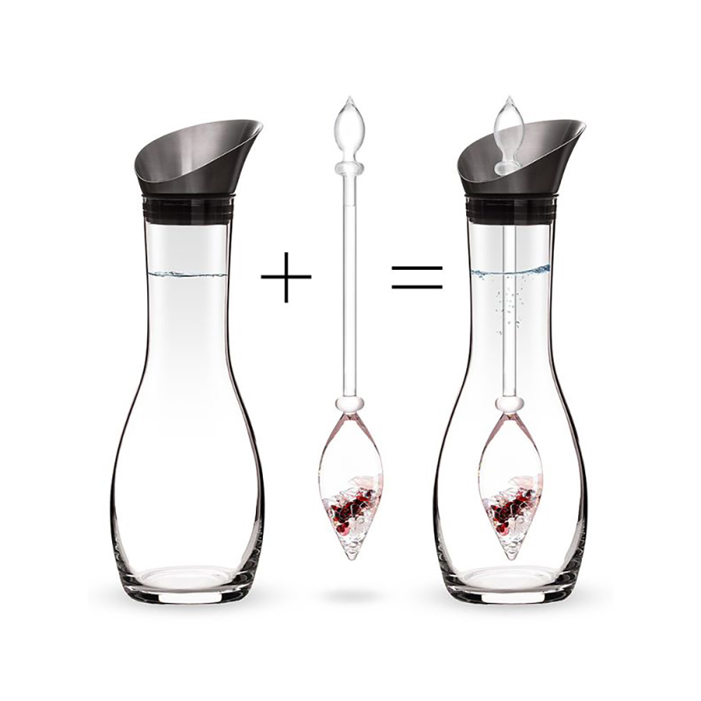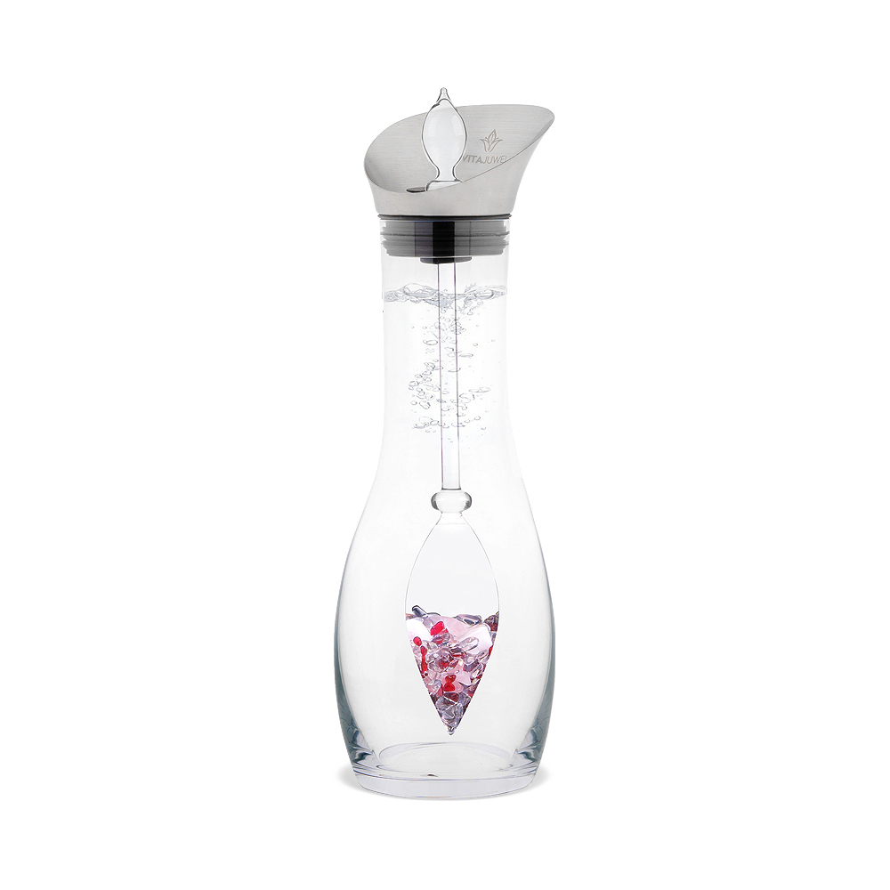 Пользоваться этим графином крайне просто: прикрепите флакон с кристаллами к носику графина, а затем вставьте его вместе с флаконом в сосуд. Флакон надежно крепится к крышке, благодаря чему он не бьется о стенку графина. Вы можете наполнить кувшин питьевой водой через носик. Благодаря уникальной форме сосуд можно наполнять и опорожнять, не снимая носик. Он также защищает вашу питьевую воду от внешнего загрязнения. Вы можете наслаждаться водой, обогащенной кристаллами, примерно через 10 минут после того, как наполнили графин.