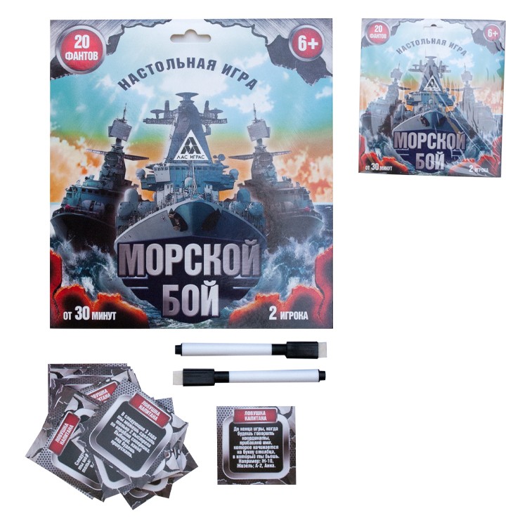Правила игры: 1. Каждый игрок берёт по два поля: "Мой флот" и "Флот противника". 2. Участники садятся так, чтобы не видеть поля друг друга и размещают на поле " Мой флот" 10 кораблей. 1 корабль - ряд из 4 клеток ("четырёхпалубный"), 2 корабль - ряд из 3 клеток ("трёхпалубный"), 3 корабль - ряд из 2 клеток ("двухпалубный"), 4 корабль - 1 клетка ("однопалубный"). Цель игры: угадать места расположения короблей соперника и потопить их. Добавьте в игру карточки - с ними вы сможете разыграть два варианта игры! Выберите одну карту и положите в стопку лицом вниз. 1) Веселье на борту. Попали мимо корабля - тяните карточку и выполняйте весёлый морской фант! 2) Ловушка капитана. Когда вы будете чертить корабли, отметьте на поле 5 бомбочек. Если соперник попадёт в бомбу - пусть тянет карту-ловушку и выполняет задание.