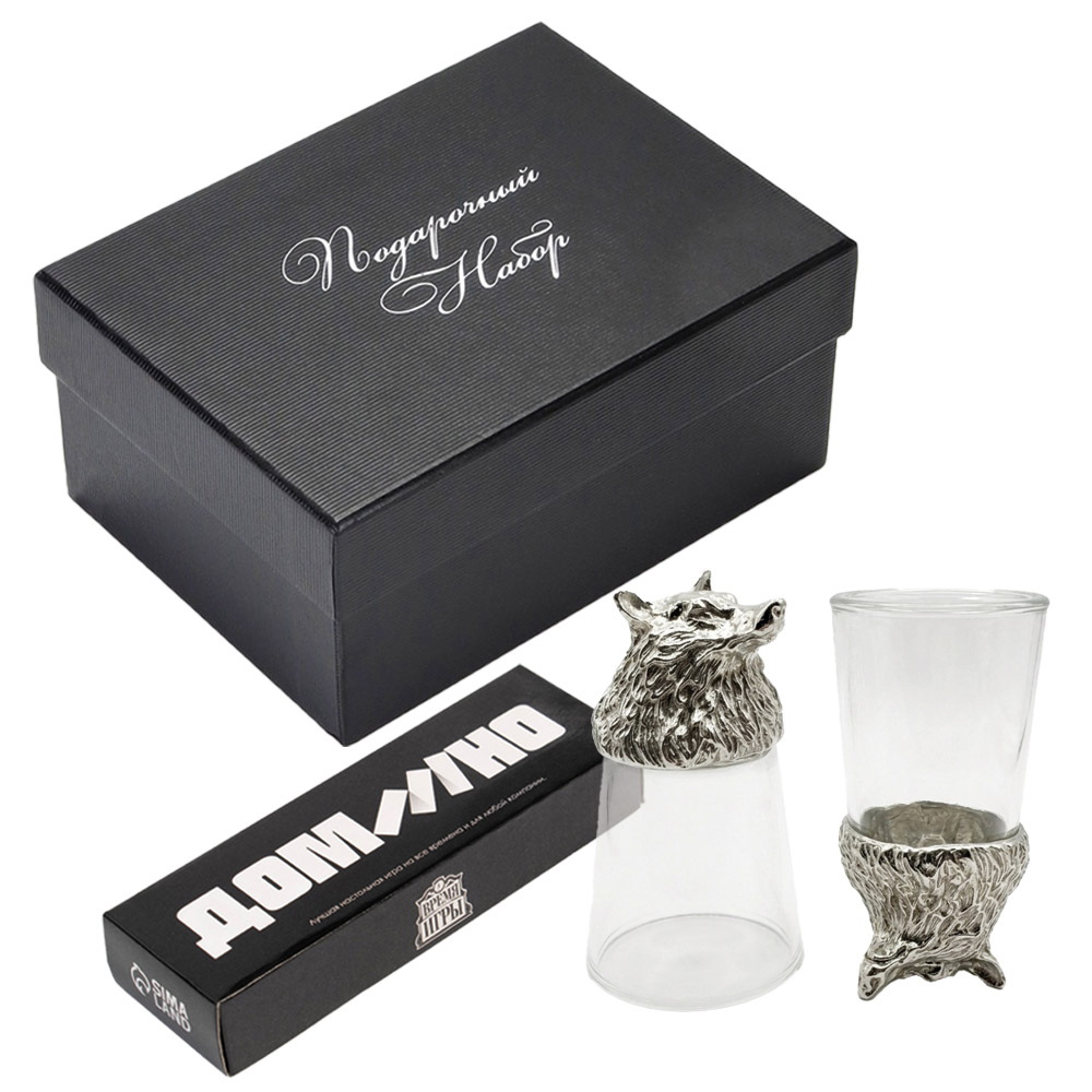 Подарочный набор 3-в-1 «Серебряный волк» – 2 рюмки 30 мл + домино