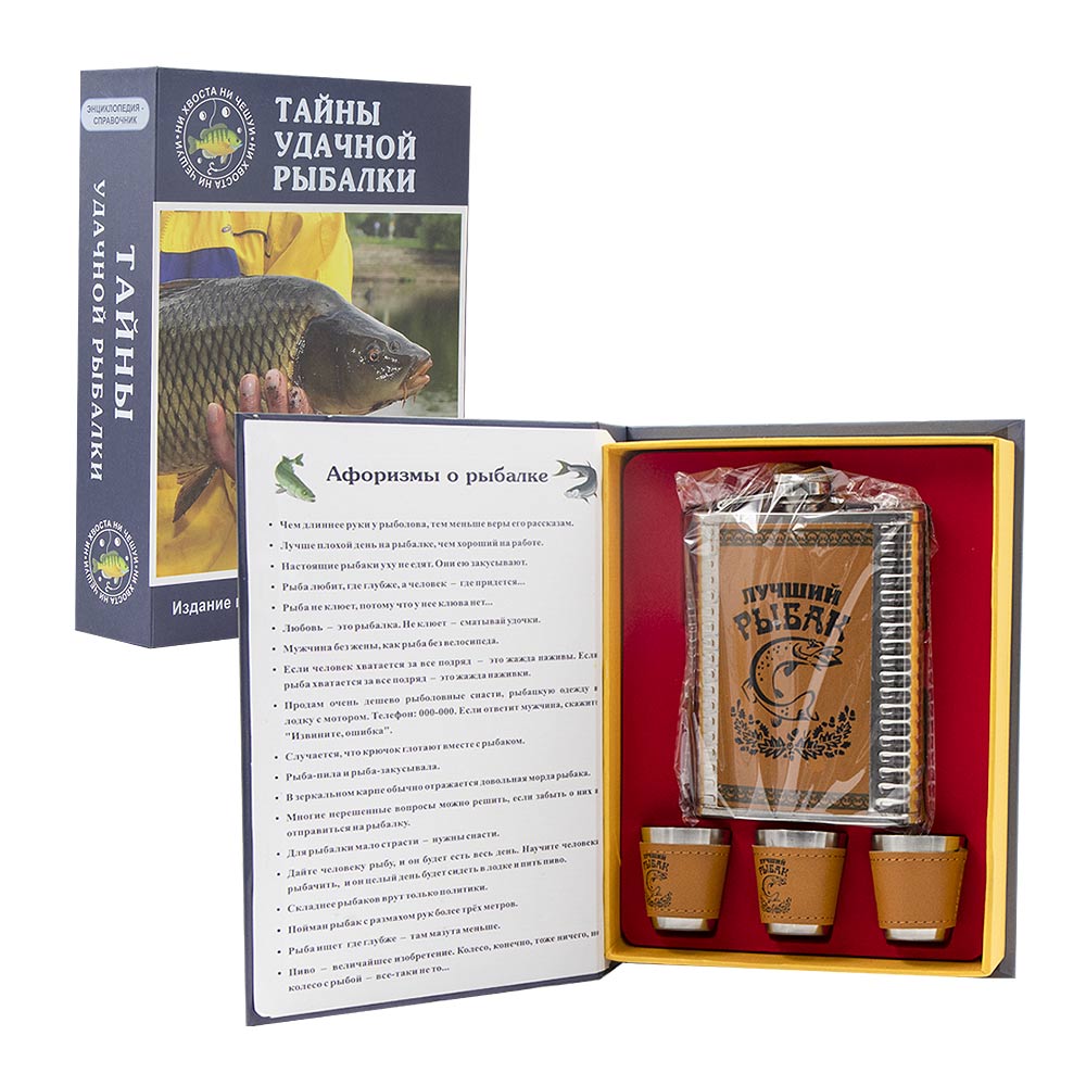 Подарочный набор для рыбака в виде книги-энциклопедии "Тайны удачной рыбалки" с фляжкой 210 мл и 3 стопками из нержавеющей стали