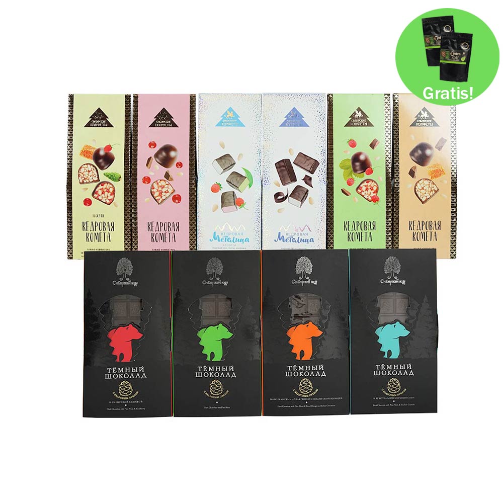 Мы собрали для вас лучшие шоколадные конфеты от "Сибирского кедра" в наборе по специальной цене:- Кедровая комета ассорти - клюква, земляника, шишка, классическая, 120 г: