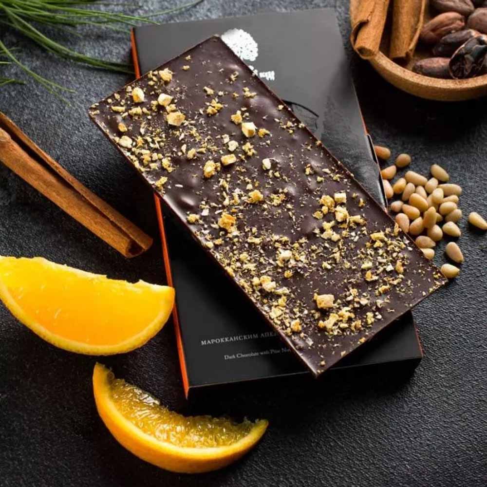 - Тёмный шоколад с кедровыми орешками, марокканским апельсином и индийской корицей, 100 г