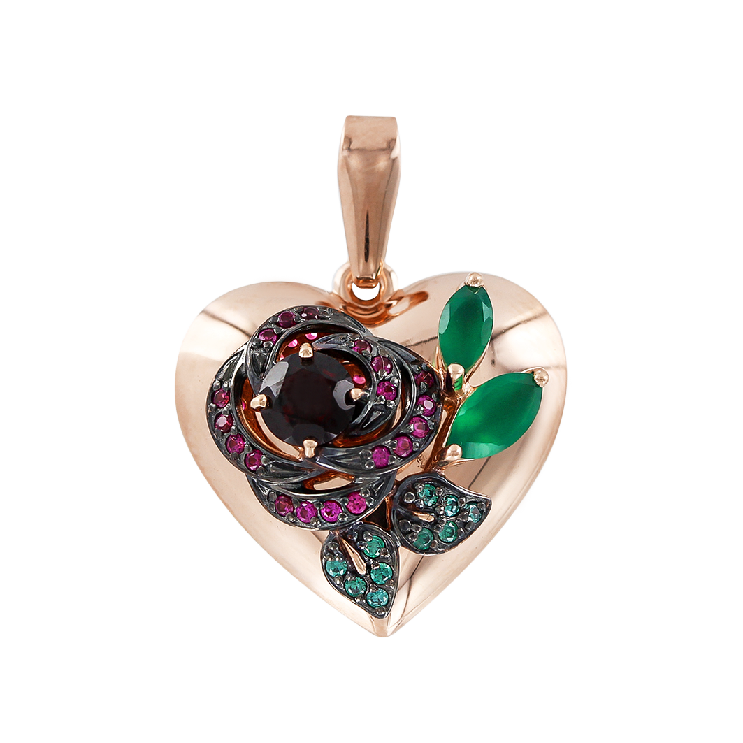 Подвеска с зеленым агатом, красным гранатом и разноцветными фианитами из красного золота 585 пробы, высота ≈ 25 мм.