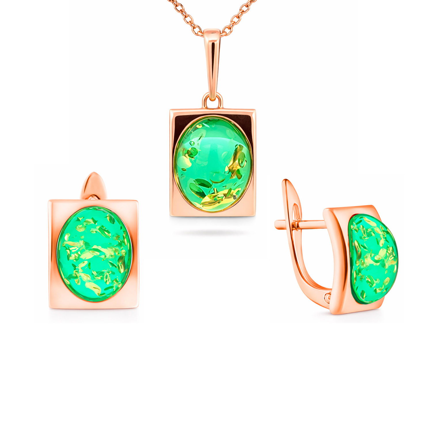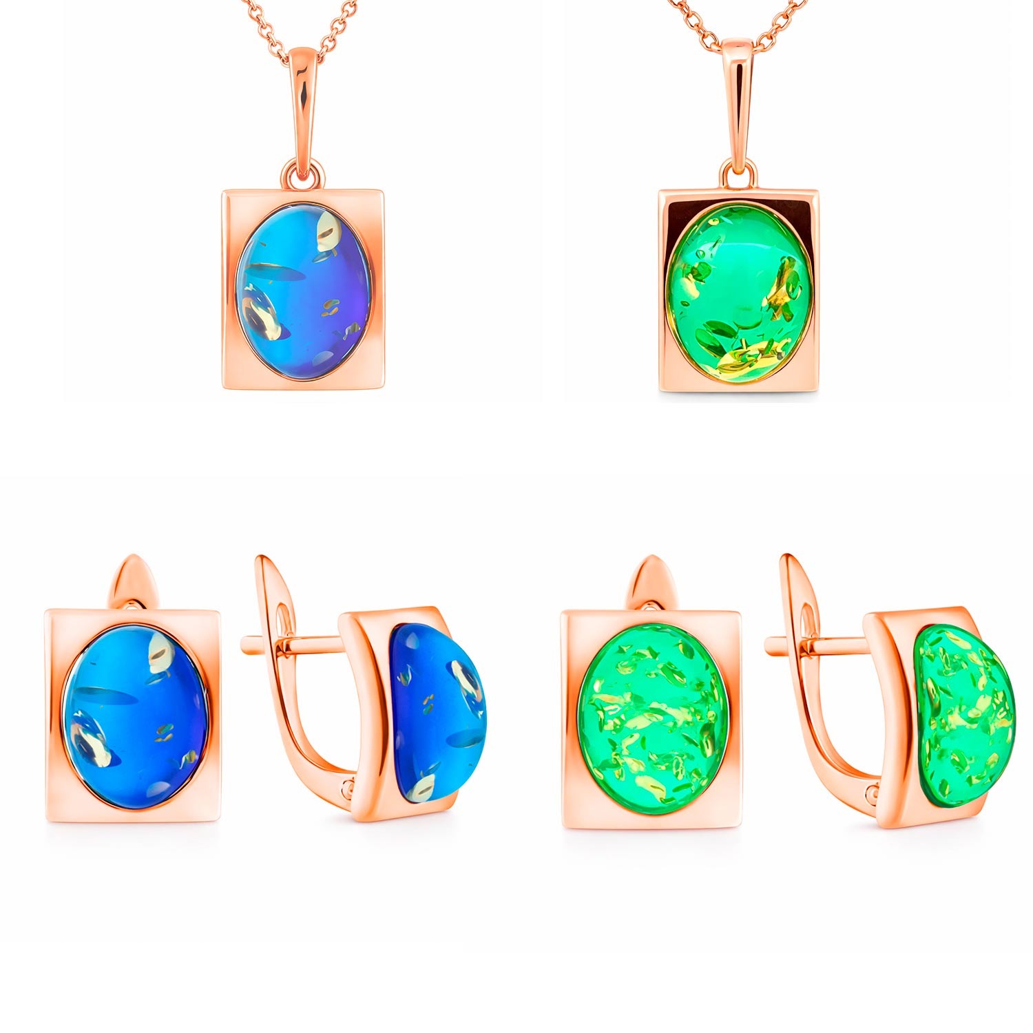 Комплект украшений из позолоченного серебра 925 пробы с овальным янтарем в квадратной оправе (синий/зеленый)