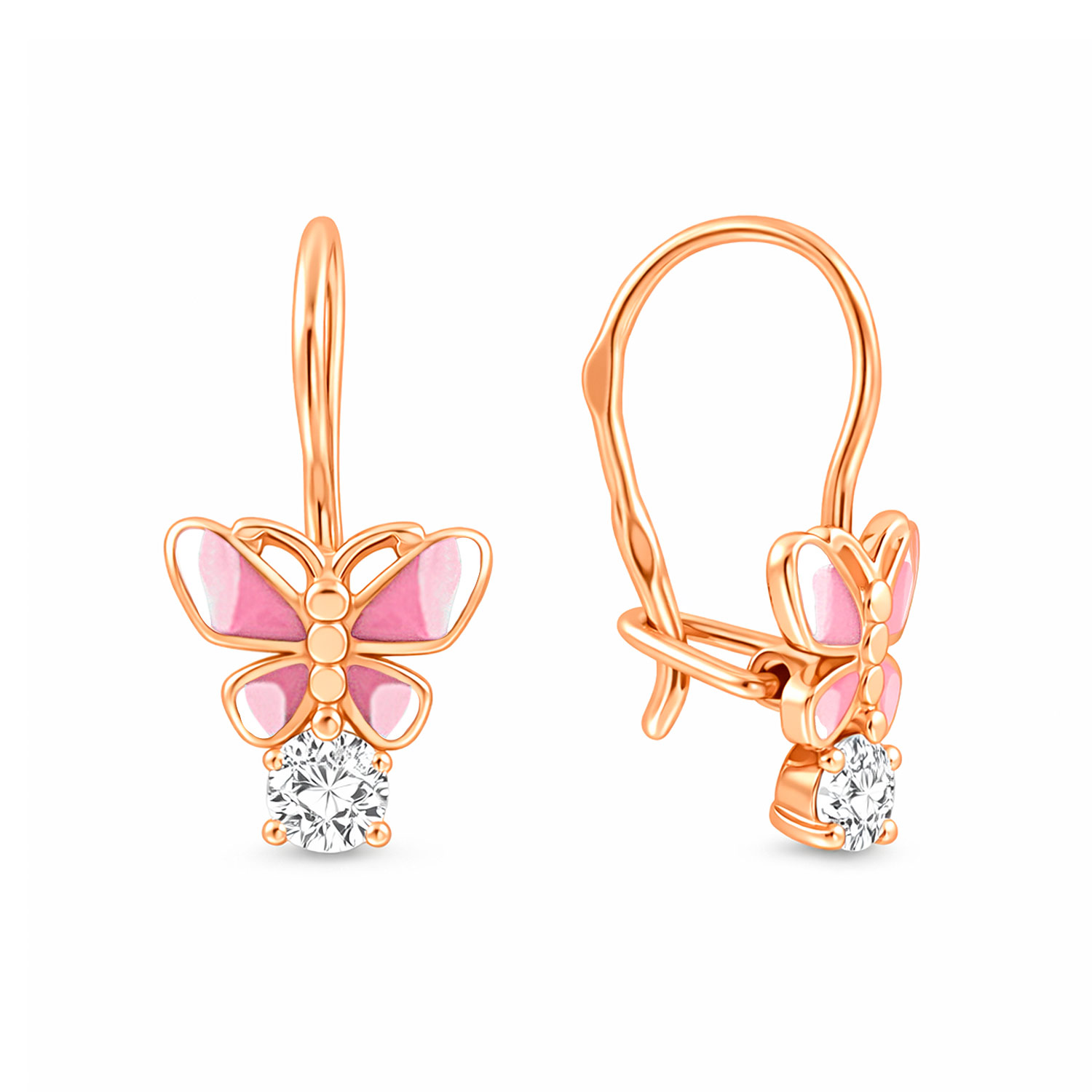 Прекрасные серьги в форме бабочек из красного золота 585 пробы, с эмалью и фианитами, высотой ≈ 16 мм. Необычная форма украшения и россыпь из сверкающих фианитов, придают живости и очарования. Бабочка является символом легкости и красоты. Такие серьги будут замечательным подарком к любому празднику.