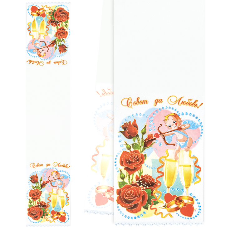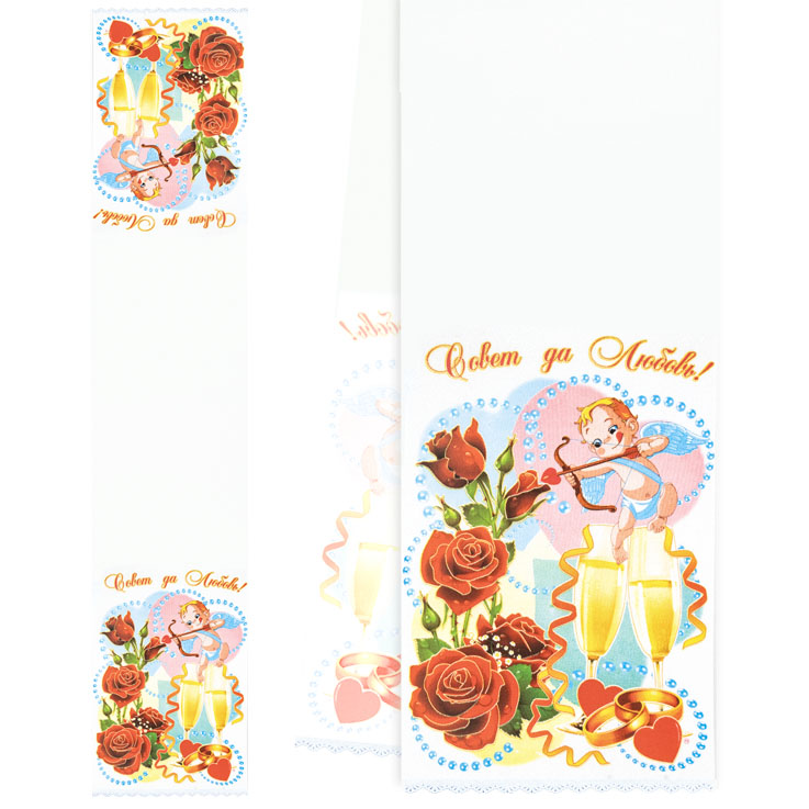 Этот изысканный свадебный рушник из белоснежного габардина станет прекрасным символом любви и единения! Роскошный дизайн с изображением Купидона выполнен методом цветной печати и украшен изящными блёстками.Размер 150 х 36 см идеально подходит для традиционных обрядов.