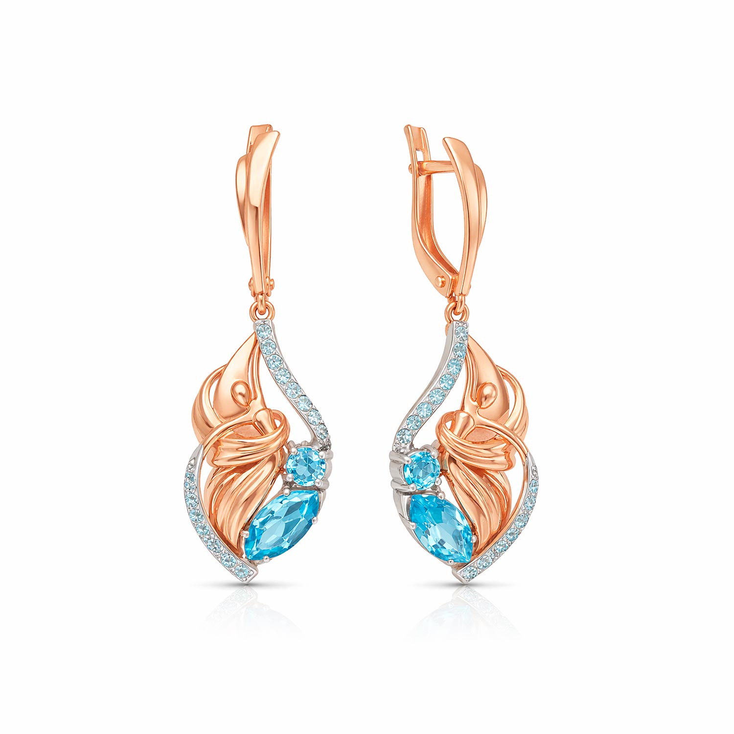 Эти изысканные серьги из красного золота 585 пробы впечатляют своим утончённым дизайном балерины, в котором линии металла напоминают лёгкое движение и воздушную пластику. Сверкающие голубые топазы разной огранки — маркиз, круг и овал — создают яркую игру света, а мелкие дорожки топазов добавляют сияния и делают украшение особенно выразительным.Это серьги, которые подчёркивают женственность, элегантность и утончённый вкус — идеальны для торжественного выхода и в качестве ценного подарка.