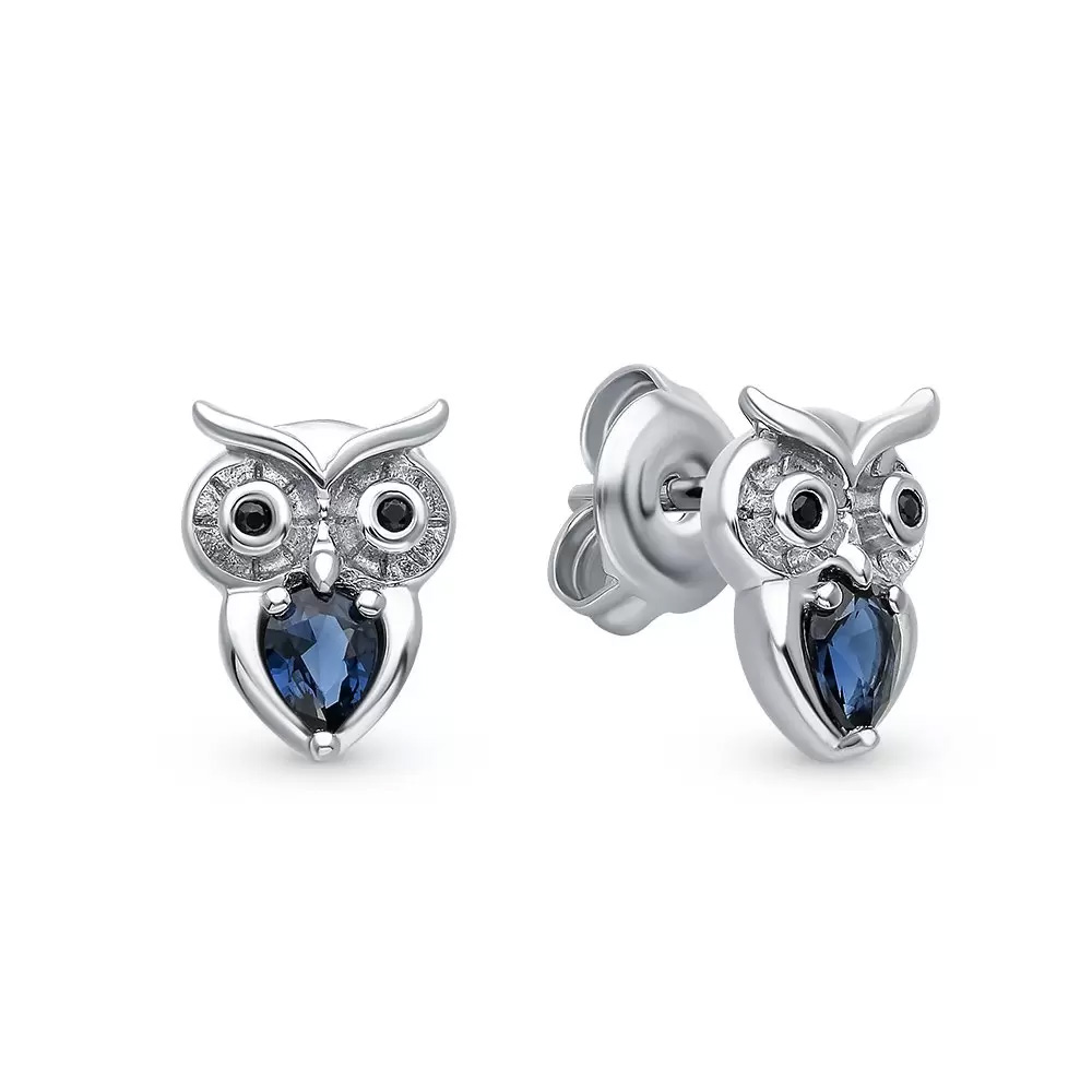 Серьги-гвоздики "Сова" из серебра 925 пробы с черным цирконием и синими сапфирами (синт.)