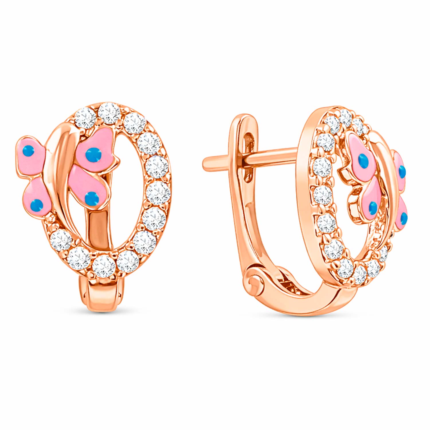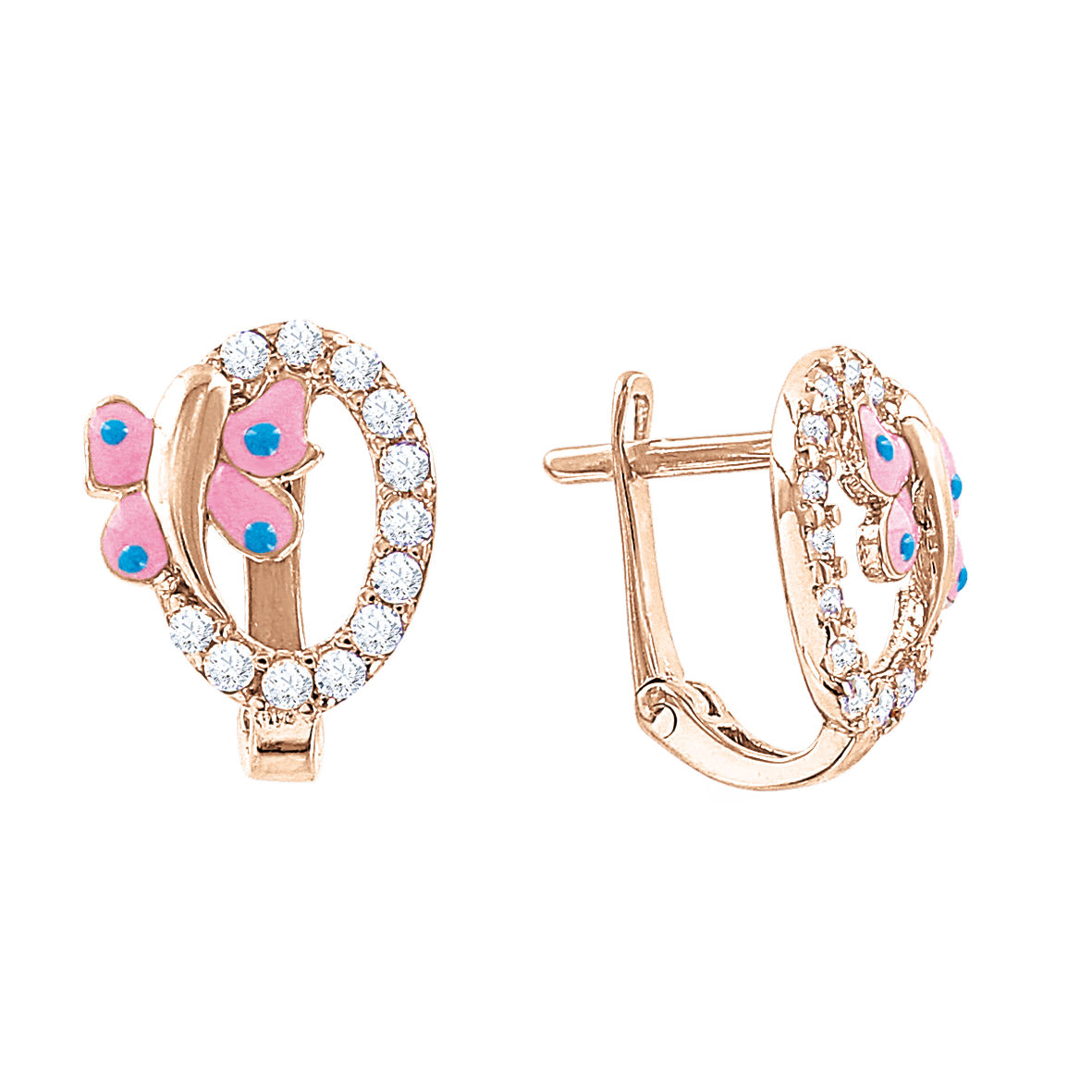 Очаровательные детские серьги из красного золота 585 пробы, с фианитами и эмалью, высотой ≈ 11 мм.