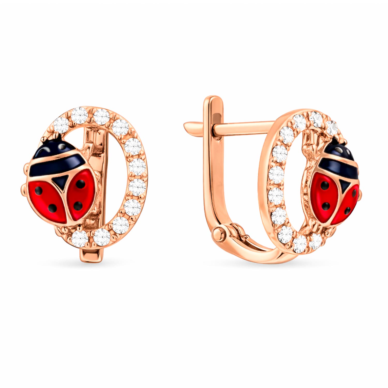 Прекрасные детские серьги из красного золота 585 пробы, с фианитами и эмалью, высотой ≈ 11 мм.