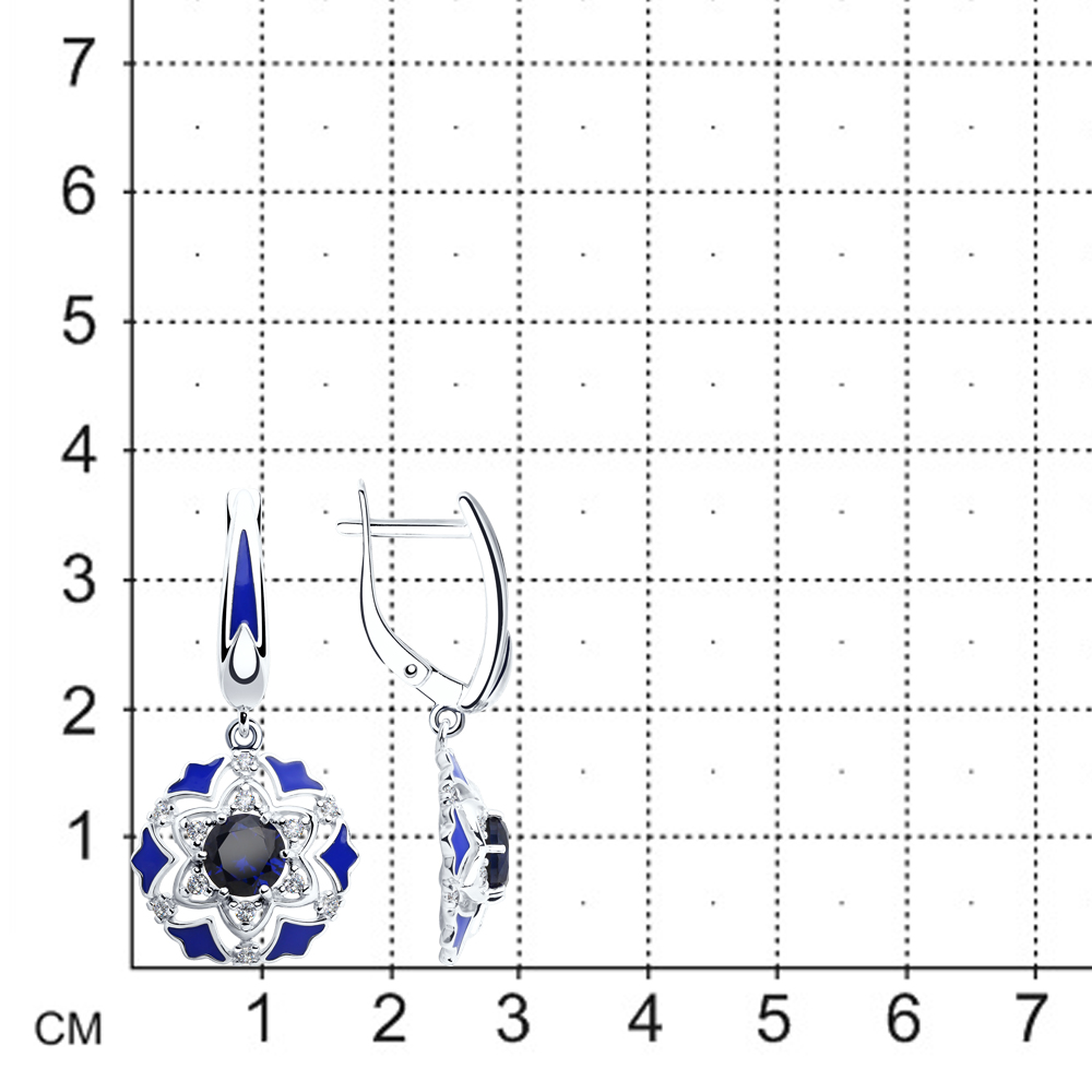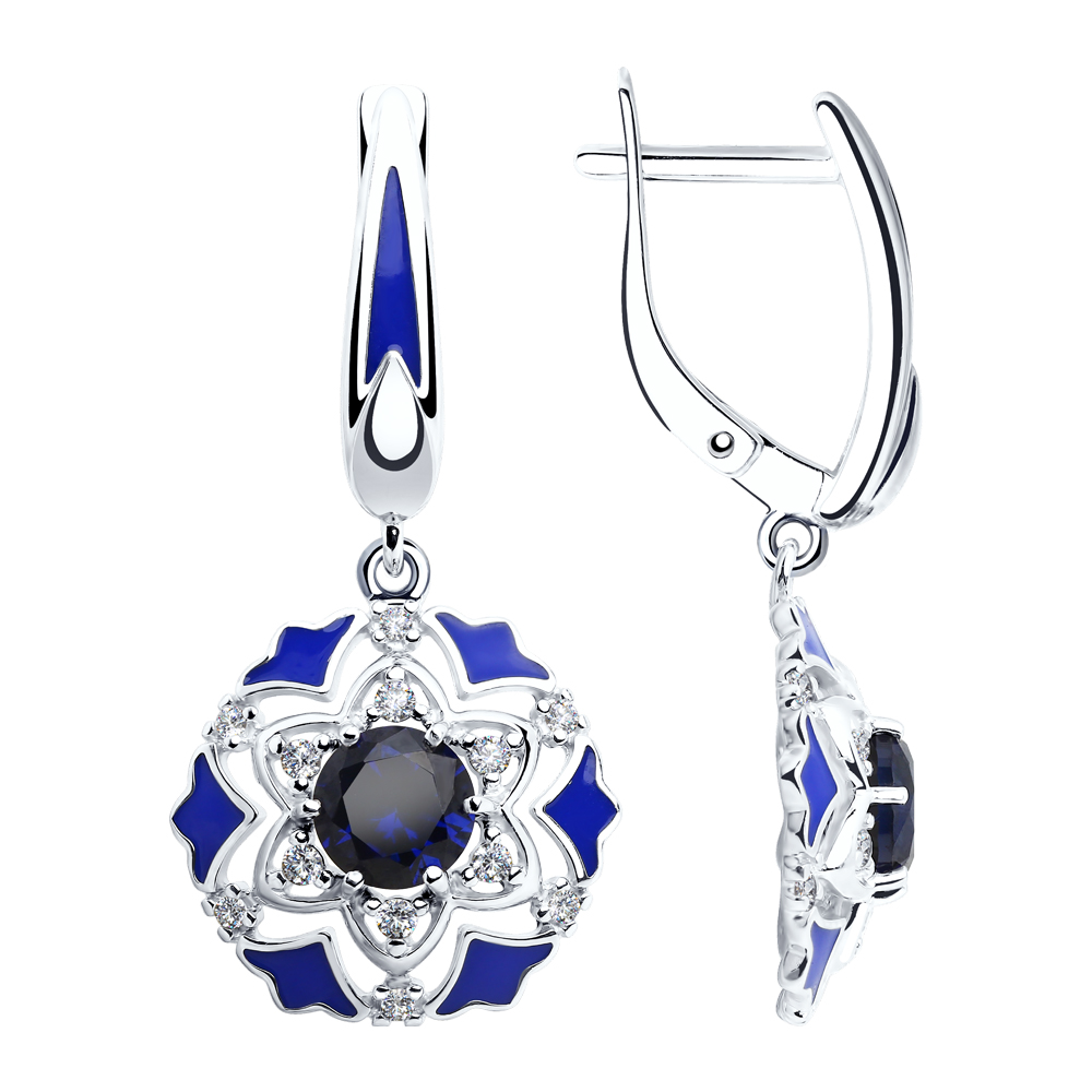 Серьги из серебра с эмалью и синими корундами и фианитами