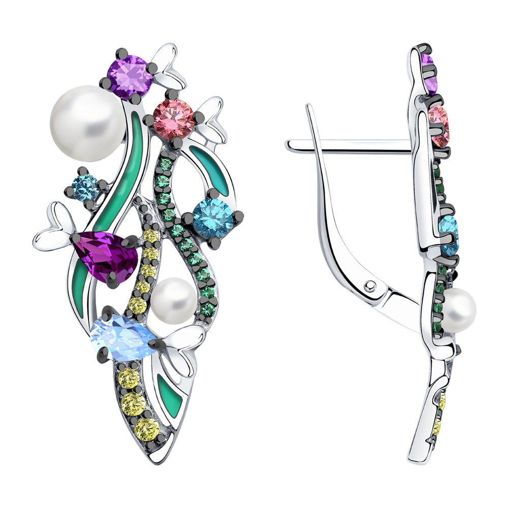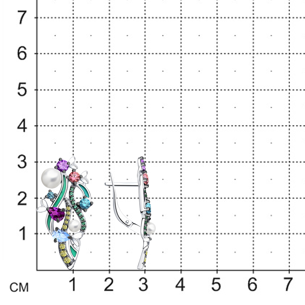 - 1х Серебряные серьги с эмалью, жемчугом и фианитами 925 пробы