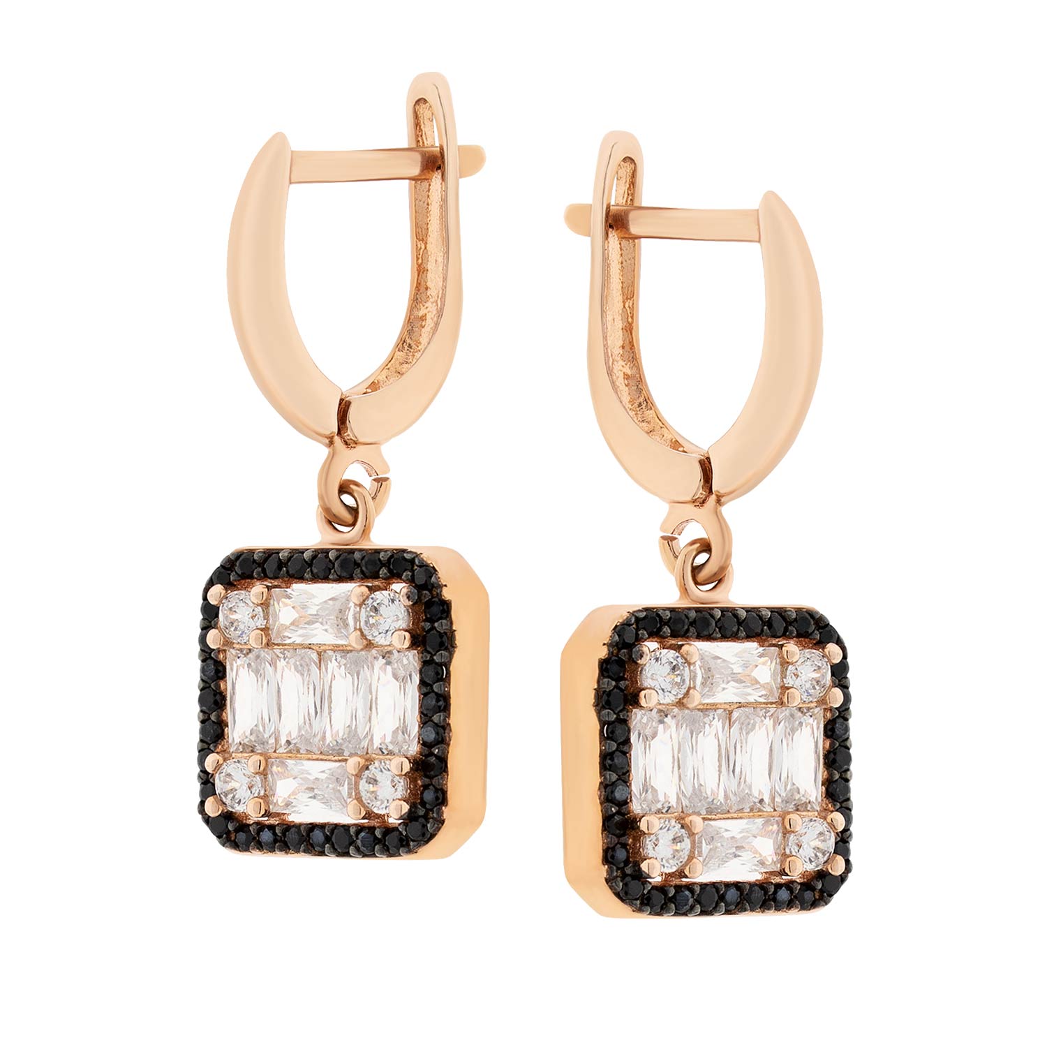 Серьги-подвески из серебра 925 пробы с белыми и чёрными фианитами, позолоченные