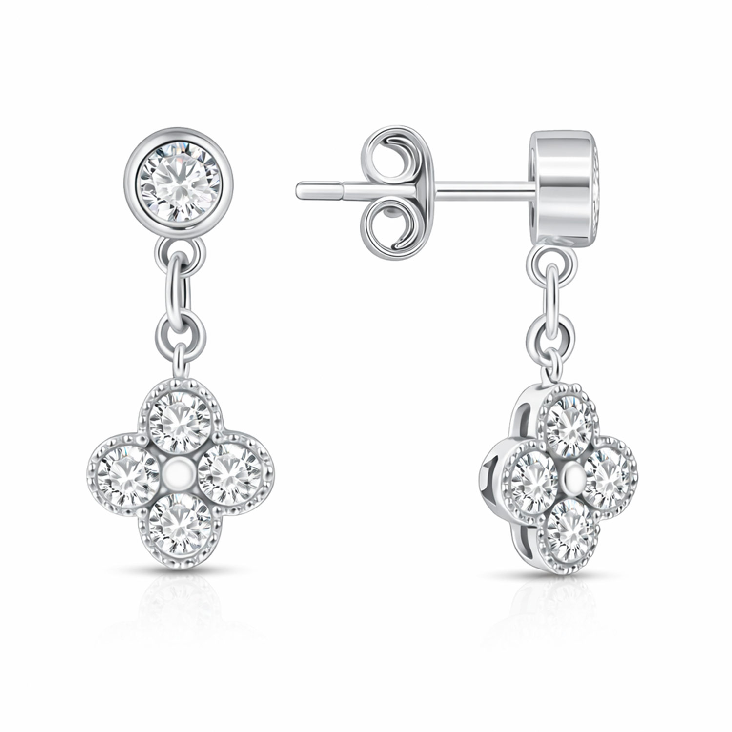 Дизайн с подвесным элементом в форме цветка (размером ≈ 7х7 мм) из четырёх камней придаёт украшению романтичный и женственный вид. Высота ≈ 18 мм делает их изящным, но заметным акцентом в образе. Блеск фианитов красиво переливается на свету, подчёркивая утончённость и стиль.Идеально подойдут как для повседневной носки, так и для особых случаев.