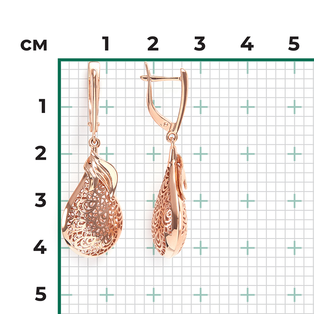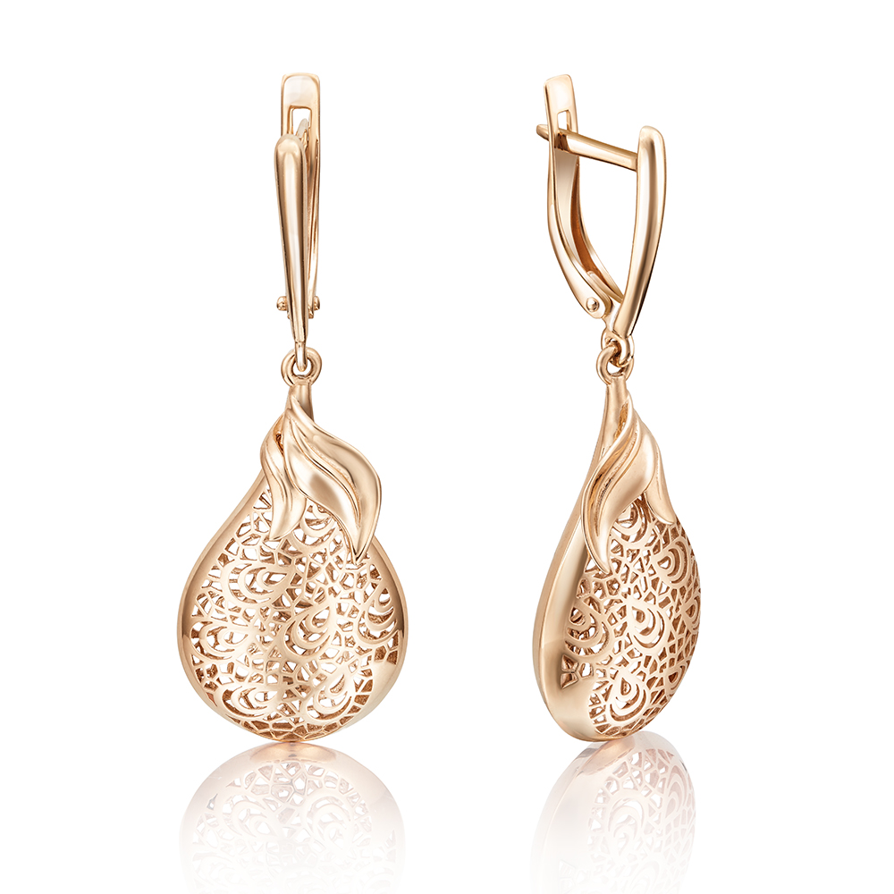 Эти серьги из красного золота 585 пробы — настоящее воплощение ювелирного кружевного искусства.