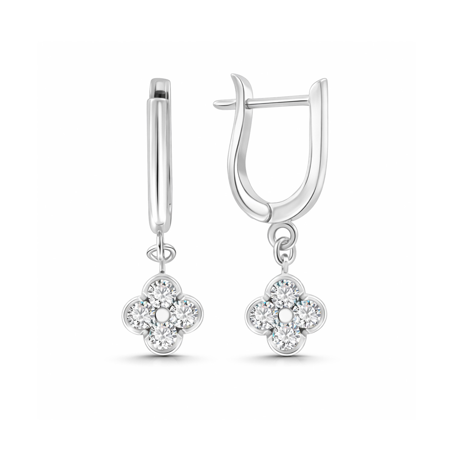 Подвесной элемент в форме цветка (размером ≈ 7x7 мм) из четырёх камней придаёт украшению утончённый и женственный вид.