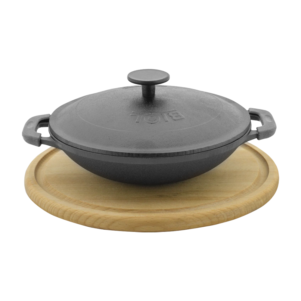 Сковорода WOK Ø 18 см с деревянной подставкой порционная с крышкой, эмаль черная (матовая), 2,1 кг