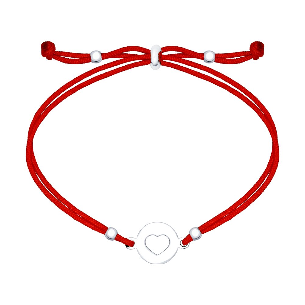 Браслет из красного шнура с декоративным элементом в форме сердца из серебра 925 пробы.