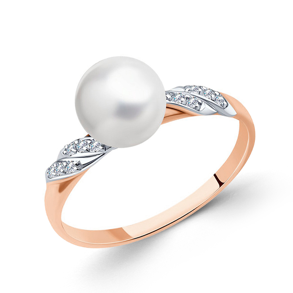 Женское кольцо из красного золота 585 пробы с пресноводной жемчужиной и кубическим цирконием SOKOLOV Gr-18,5 мм